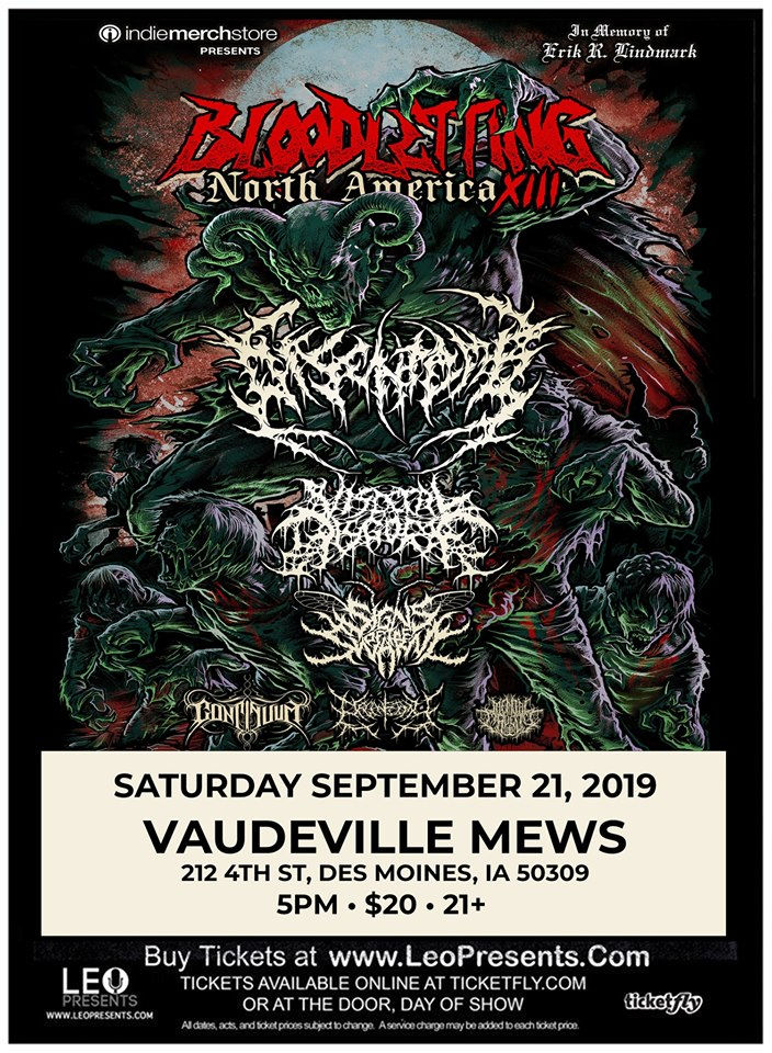 September 21st 5pm at Vaudeville Mews, Des Moines: Bloodletting North America XIII Featuring DISENTOMB - VISCERAL DISGORGE SIGNS OF THE SWARM - CONTINUUM ORGANECTOMY - MENTAL CRUELTY - GUILTY OF TREASON - OPPRESS THE TYRANT. 21+ $20